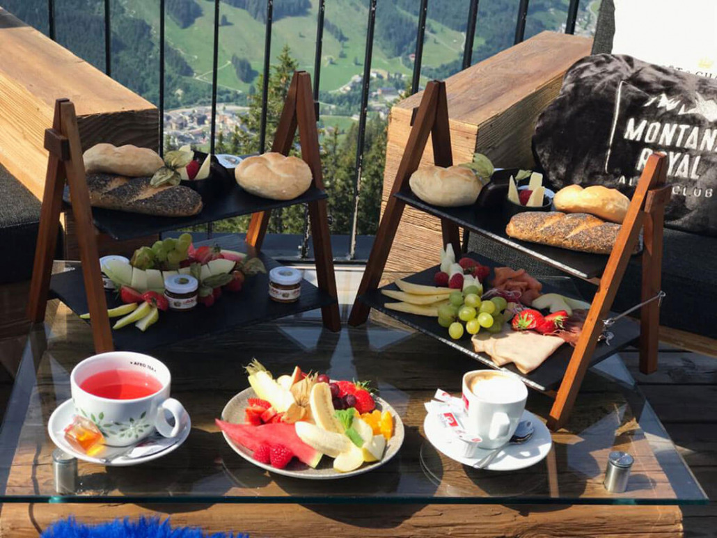 „Den Tag in den Bergen startet man hier optimal mit einem entspannten Snack bei einzigartigem Panorama. Mittags wird mit feinsten Gaumenfreuden und traditionellen Gerichten verwöhnt. Den einzigartigen Sonnenuntergang genießt man in „royal“ exklusiver Atmosphäre, Lounge- und House Musik und leckeren Cocktails auf der Sonnenterrasse.“
